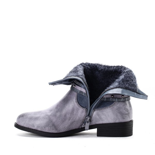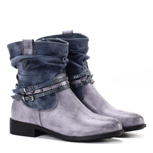 • Oryginalne botki na płaskim obcasie. Buty posiadają cholewkę z eko zamszu. Na wysokości kostki znajdują się trzy paski zapinane na klamerki, ozdobione ćwiekami i drobnymi dżetami. Model w środku ocieplany futerkiem. Solidnie wykonane i bardzo wygodne.