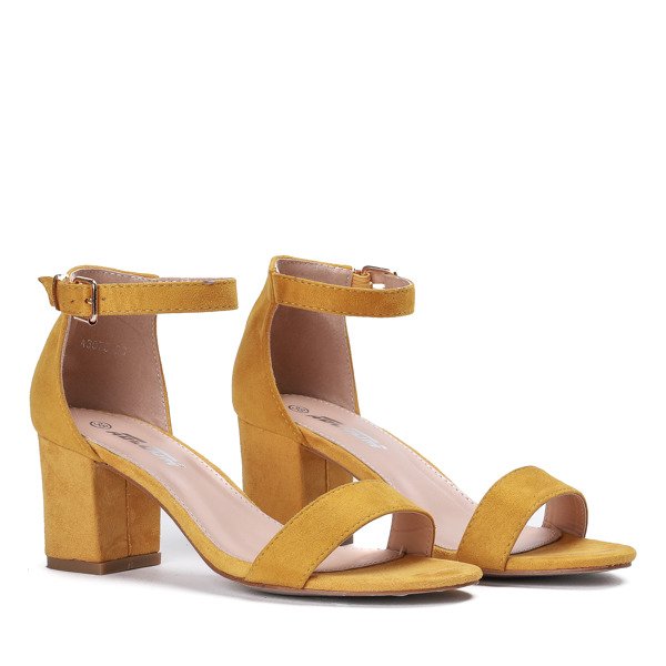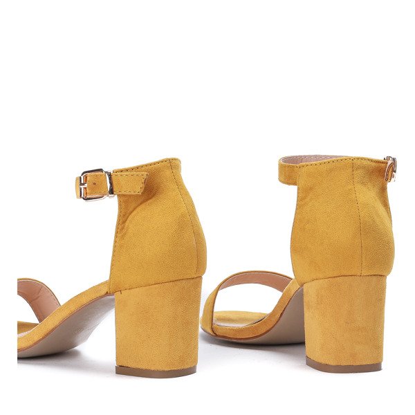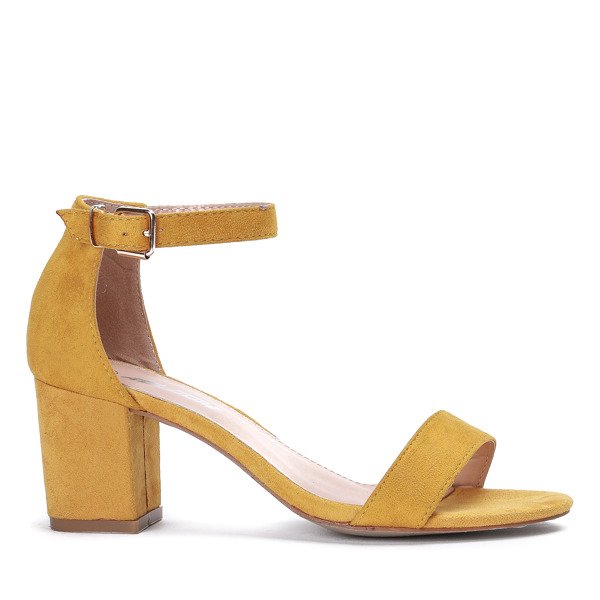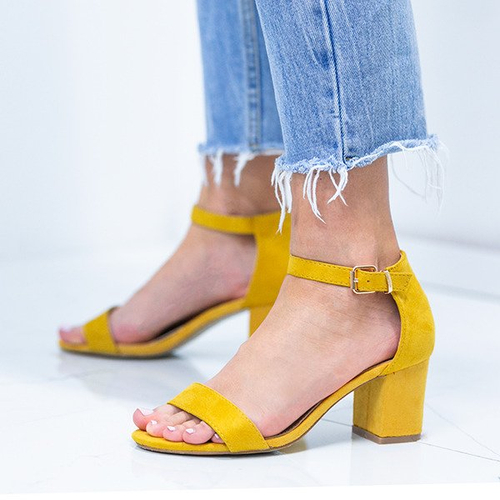 - Bardzo eleganckie sandały na niskim słupku w kolorze żółtym o odcieniu musztardowym. Buty ze skóry ekologicznej zamszowej. Model zapinany sprzączką na kostce. Idealne do sukienek!
