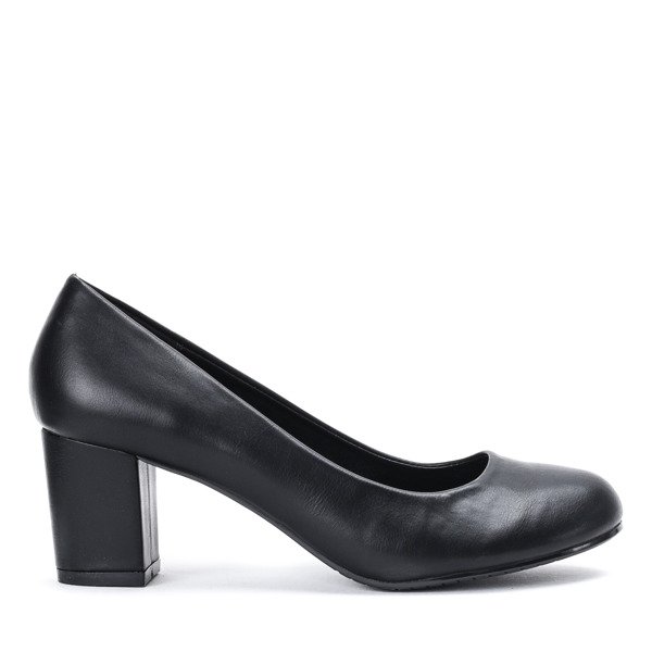- Klasyczne czółenka na średnim słupku w kolorze czarnym. Materiał wykonany ze skóry ekologicznej. W środku posiadają miękkie poduszeczki pod stopami. Klasyczny model, który sprawdzi się zarówno do sukienek jak i spodni.
