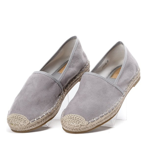 • Klasyczne damskie espadryle w kolorze szarym wykonane ze skóry ekologicznej zamszowej. Wkładka z materiału tkaninowego. Model zdobiony sznureczkiem jutowym na krawędziach podeszwy oraz nosku.