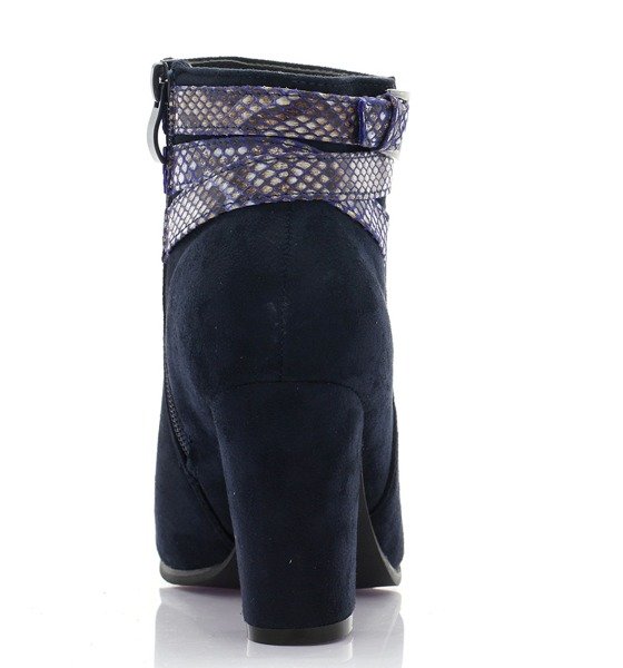 - Rewelacyjne botki na stabilnym słupku wykonane z eko-zamszu. Model zasuwany na suwak. Bardzo wygodne i solidnie wykonane. W środku delikatne ocieplenie. Cholewka zdobiona paskiem z klamrą imitującym skórę węża.