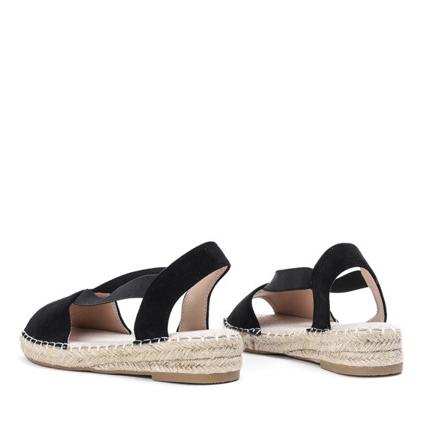 - Černé sandály na nízké platformě. Přední a zadní popruhy jsou vyrobeny z ekologického semiše, další dva popruhy jsou pryžové. Stélka je potažena ekologickou kůží. Podešev prezentované dámské obuvi je zdobena provázkem z juty.