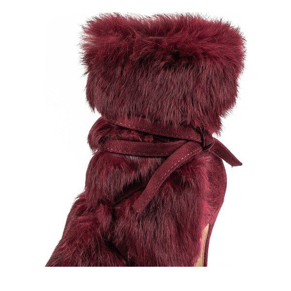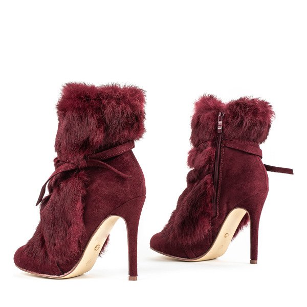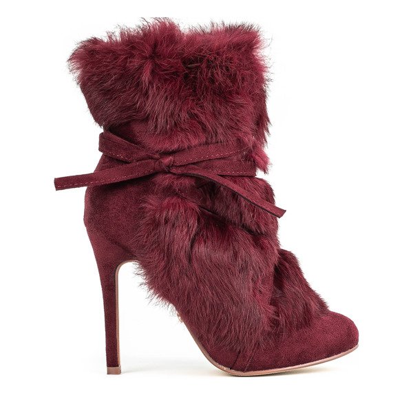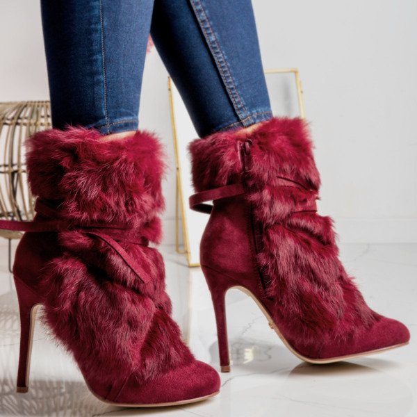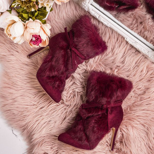 - Efektowne botki na szpilce wykonane z eko-zamszu w kolorze bordowym. Obuwie damskie jest zapinane na zamek po wewnętrznej stronie. Wkładka buta jest wykonana z eko-skóry. Miłe w dotyku futerko umieszczone na cholewce dodaje interesującego wyglądu!