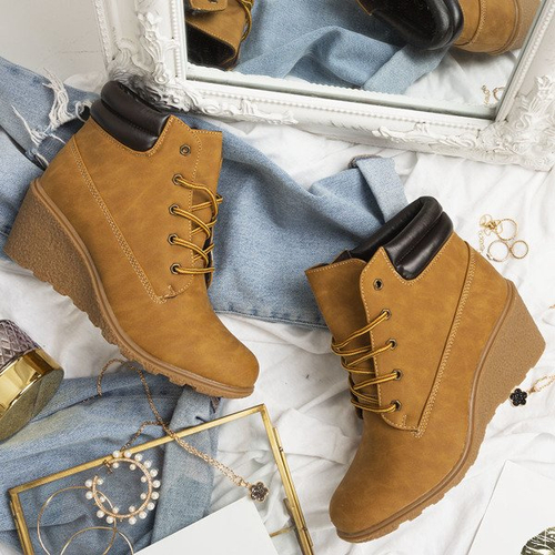 Brązowe botki na koturnie z czarną wstawką Marona - Obuwie
