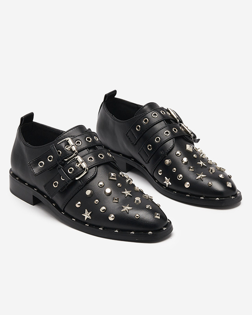 • Černé boty s nízkými podpatky z ekologické kůže. Model je zdoben stříbrnými ornamenty. Dámské boty se zapínáním na přezky. Budou se perfektně hodit k džínám.