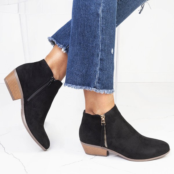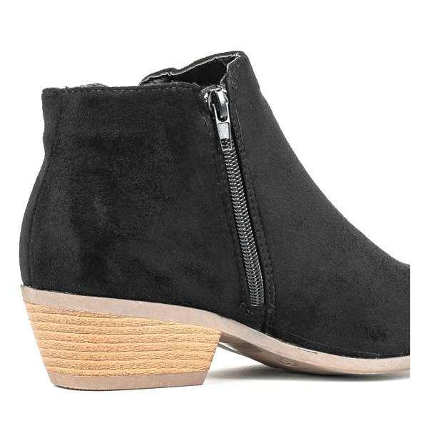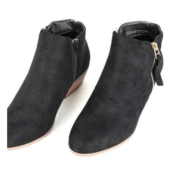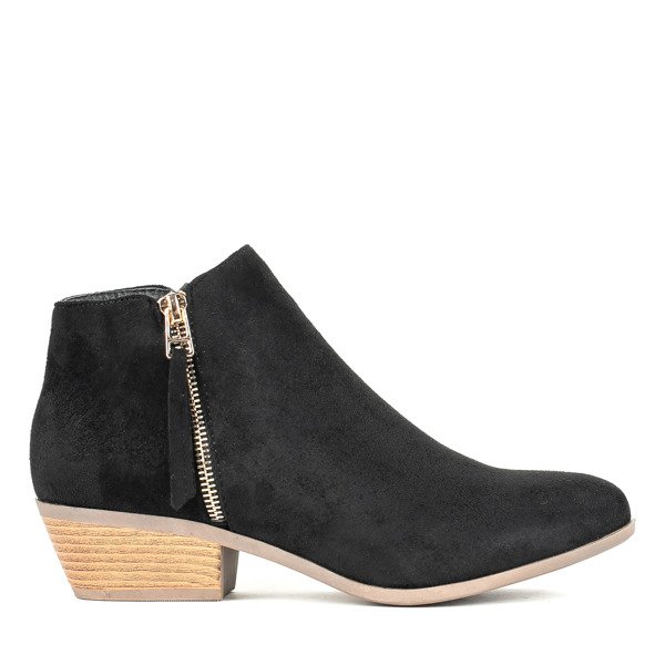 - Klasyczne kowbojki na płaskim obcasie. Materiał wykonania cholewki to eko-zamsz w czarnym kolorze. Wkładka pokryta eko-skórą. Obuwie jest zapinane na suwak po wewnętrznej stronie. Botki posiadają ozdobny złoty zamek. Idealne do codziennej garderoby.