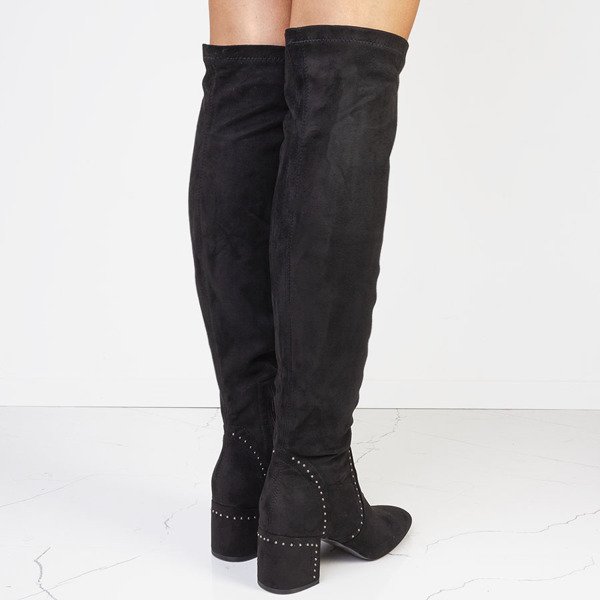 - Boty na sloupku se čtvercovou špičkou. Vyrobeno z černého eko semiše. Stélka z přírodní kůže. Obuv se zapíná na zip. Mají ozdoby ve formě kamínků. POZNÁMKA: přední část podešve může mít škrábance.