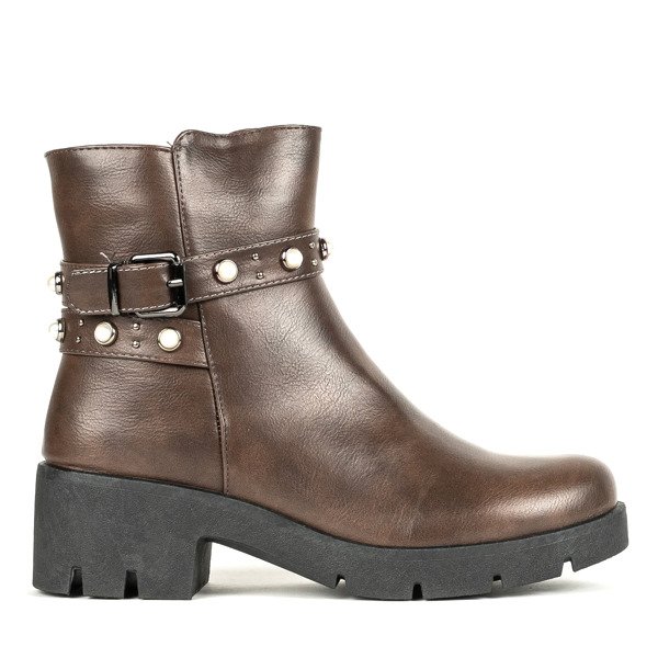 - Klasické hnědé boty s tlustými podpatky vyrobené z ekologické kůže. Hnědý model. Spona na boku zdobená perlami. Uvnitř není žádné oteplování. Ideální obuv pro džíny.