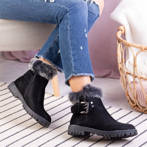 • Wygodne botki na płaskim obcasie z okrągłym noskiem. Materiał wykonania to eko skóra nubuk w czarnym kolorze. Środek buta jest wyłożony tkaniną. Górna część cholewki ozdobiona futerkiem. Obuwie posiada zapięcie na zamek oraz ozdobną klamrę.