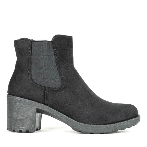 - Czarne botki na wyższym słupku wykonane ze skóry ekologicznej zamszowej. Wkładka w środku wykonana z materiału tkaninowego. Po boku zapinane suwakiem. Idealne buty do Twojego płaszcza.