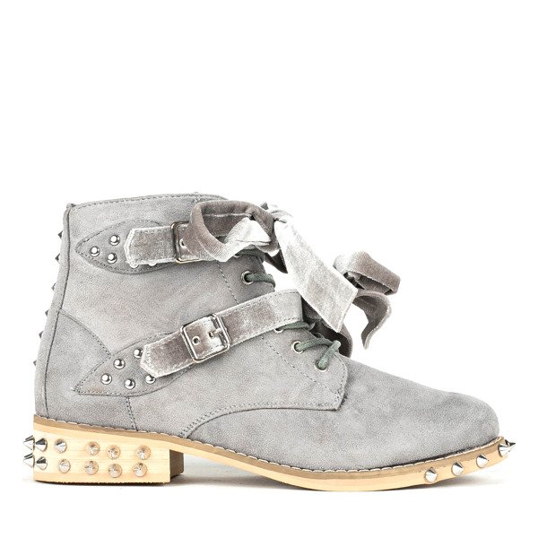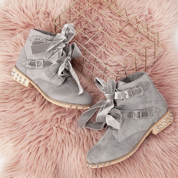 - Pracovníci s plochými podpatky v šedé barvě. Zipovaný a šněrovaný. Svršek z ekologického semišového materiálu. Přidání cvočků a mašlí je dělá mezi botami jedinečnými. Pevné. Odpovídají mnoha stylům.