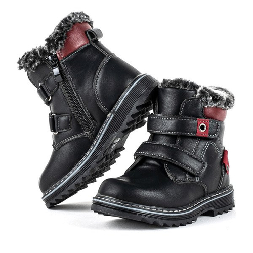 • Cieple zimowe chłopięce trapery w kolorze czarnym z czerwonymi wstawkami. Cholewka wykonana ze skory ekologicznej. Model zapinany na rzepy oraz suwak po zewnętrznej stronie. Buty są ocieplane miękkim futerkiem.