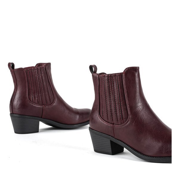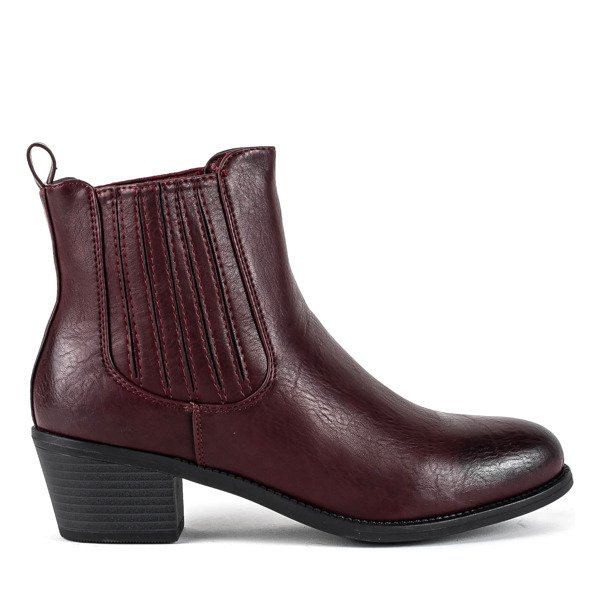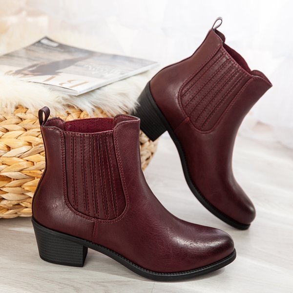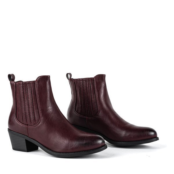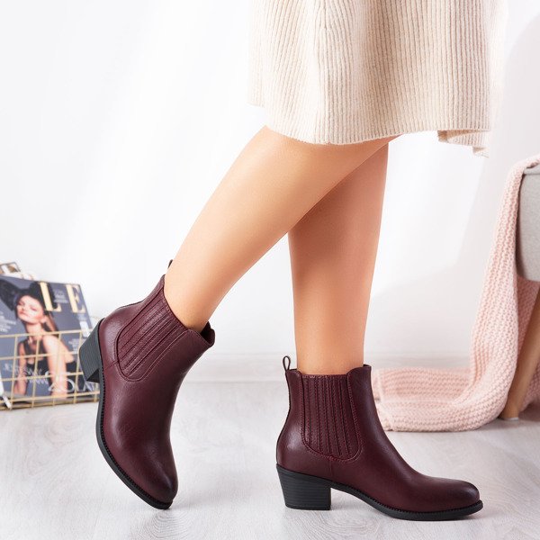 - Botki w kolorze bordowym o klasycznym fasonie, wykonane ze skóry ekologicznej. Model na niskim słupku. Sztyblety nie posiadają ocieplenia ani zapięcia. Świetnie wkomponują się do Twoich jeansów.