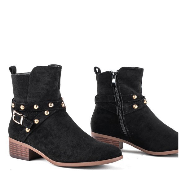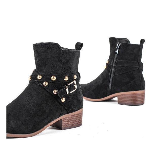 • Ploché kotníkové boty vyrobené z ekologického semiše v černé barvě. Vnitřek obuvi je potažen kožešinou. Obuv má uvnitř zdrhovadlo. Boty jsou zdobeny pásem se sponou a zlatými tryskami.