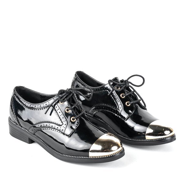 • Vkusné dámské nízké podpatky se zlatou špičkou. Vyrobeno z lakované kůže. Krajka nahoru. Podešev má kovovou povrchovou úpravu. POZNÁMKA: boty mohou mít na horní straně škrábance.