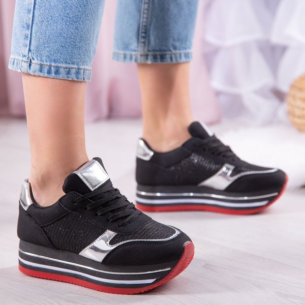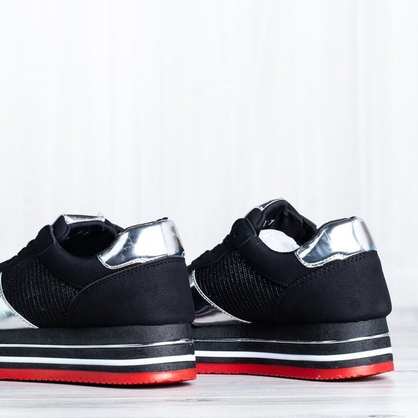 • Poutavé tenisky s platformou. Svršek je kombinací matné černé eko kůže, tkaniny a lakované stříbrné eko kůže. Uvnitř boty je podšívka. Podešev boty je v živé červené barvě.