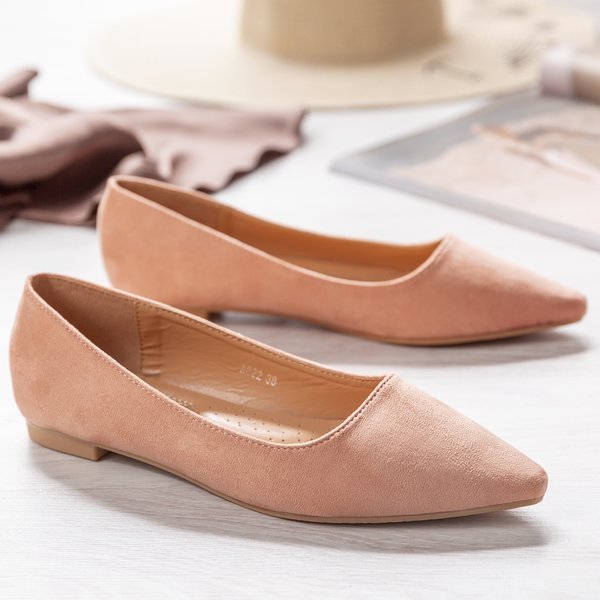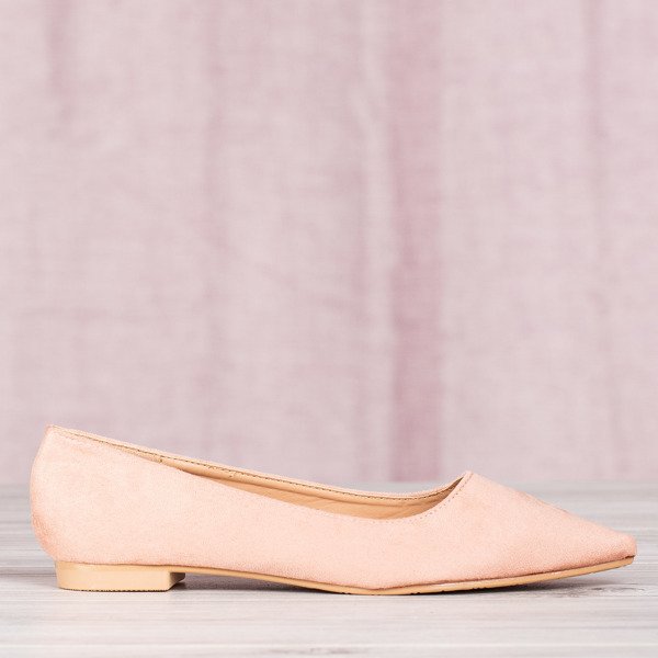 • Klasické baleríny vyrobené z semišové kůže. Růžový model. Nos je sklopený. Stélka z eko kůže. POZNÁMKA: Některé modely mohou mít na materiálu stopy lepidla.