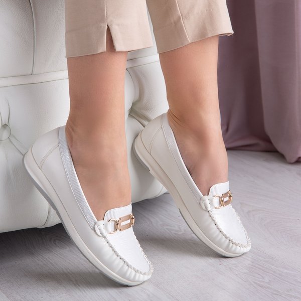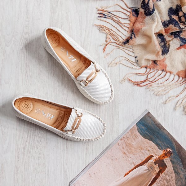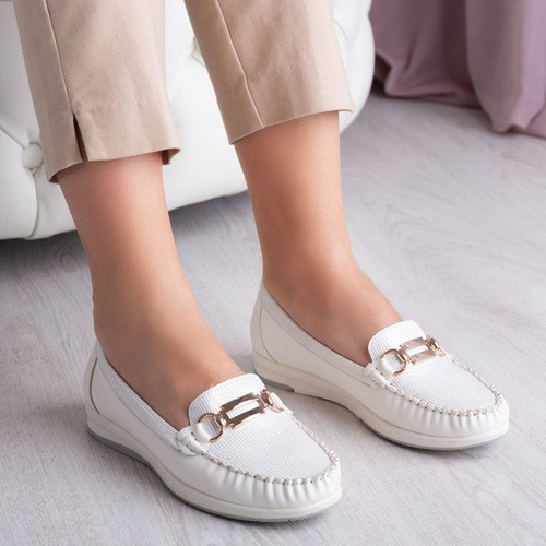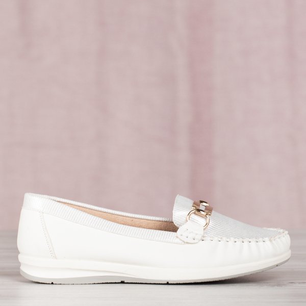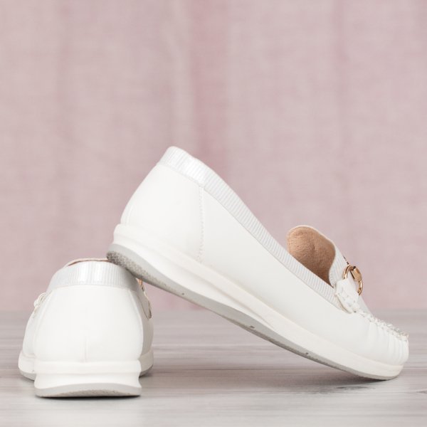 • Klasické bílé mokasíny na ploché podrážce, vyrobené z eko kůže. Svršek má lesklý povrch. Zlatý kovový ornament na nose. POZNÁMKA: model pro chodidlo s úzkou anatomií chodidla