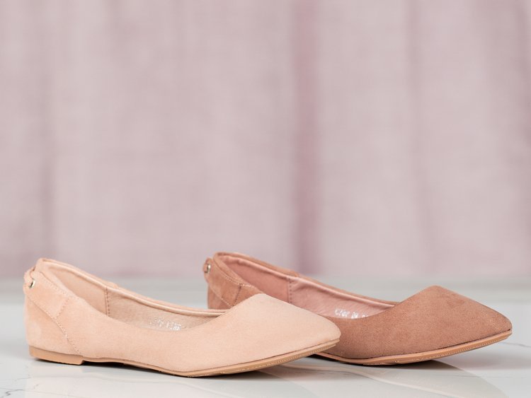 - Dámské růžové baleríny v nejjednodušším provedení. Model s plochým podpatkem s mandlovou špičkou. Obuv z eko semiše. Zadní část svršku má ozdobu. POZNÁMKA: Obuv může mít na materiálu stopy lepidla.