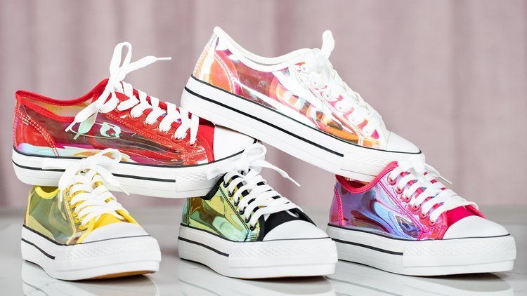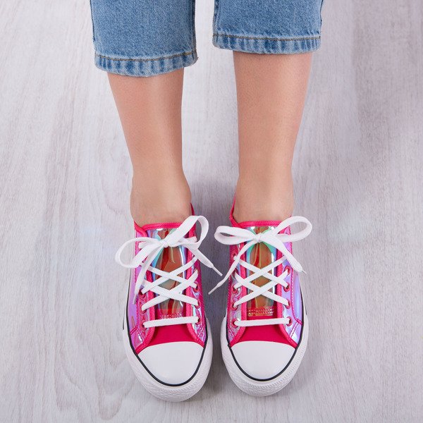 - Působivé tenisky vyrobené z průhledného materiálu s transparentním efektem. Boty mají růžovou povrchovou úpravu. Krajka nahoru. Z prezentované obuvi můžete vytvořit originální výtvor. POZNÁMKA: Některé modely mohou mít na materiálu lepidlo