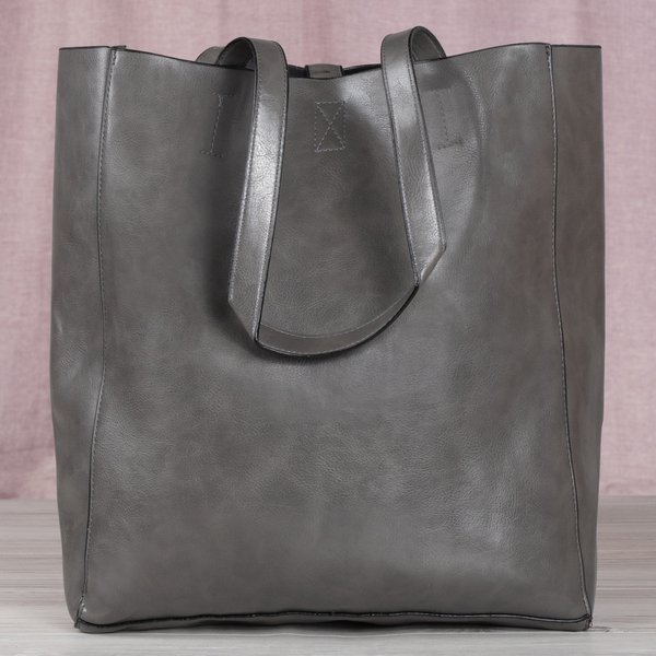 - Taška vyrobená z ekologické kůže v šedé barvě. Uvnitř je velký prostor a 1 menší kapsa na kosmetičku. Model se zapíná tlačítkem. Taška je dodávána s dlouhým popruhem.