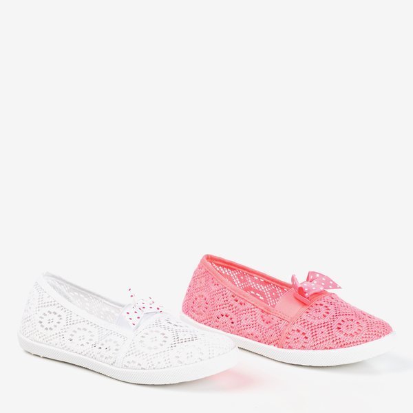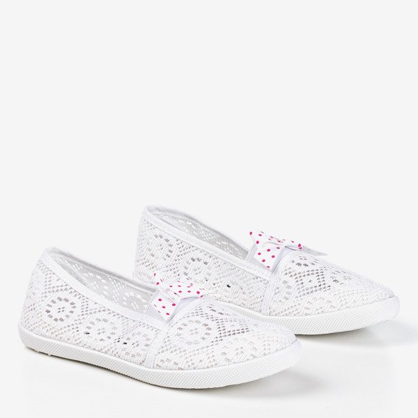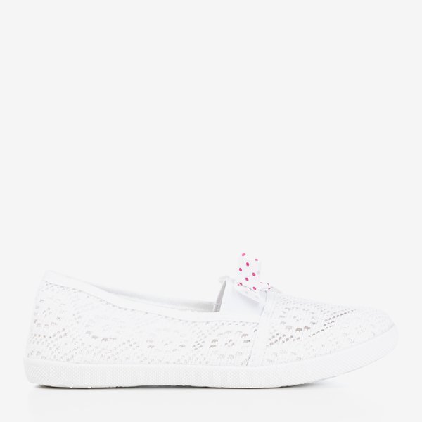 - Okouzlující dívčí baleríny na gumové podrážce. Materiál - bílá krajka. Uvnitř obuvi je vložena tkanina. Model zdobený bílou mašlí v růžové skvrně