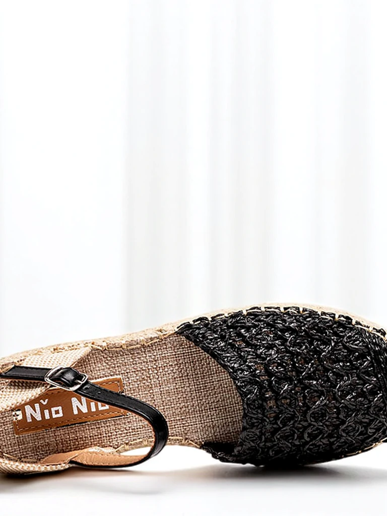- Černé dámské espadrily na nízké platformě. Svršek z plastu. Podešev zdobená pleteným jutovým provázkem. Model je připevněn přezkou. Textilní pravítko. Ideální