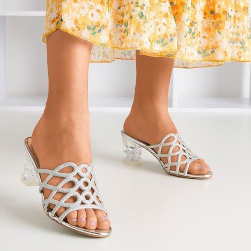 - Úžasné dámské žabky na vyšší transparentní patě. Materiál ekologická kůže potažená stříbrným brokátem. Svršek má výřezy. Stélka ze stříbrného plastu
