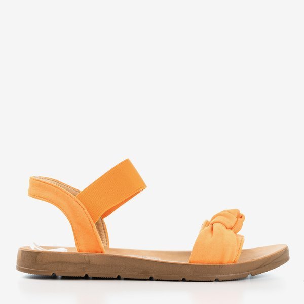 - Dámské sandály Neon Orange na ploché podrážce. Proužky z eko semišové kůže a popruh na prstech zdobený vázáním. Model má pružnou elastickou gumu na nártu.
