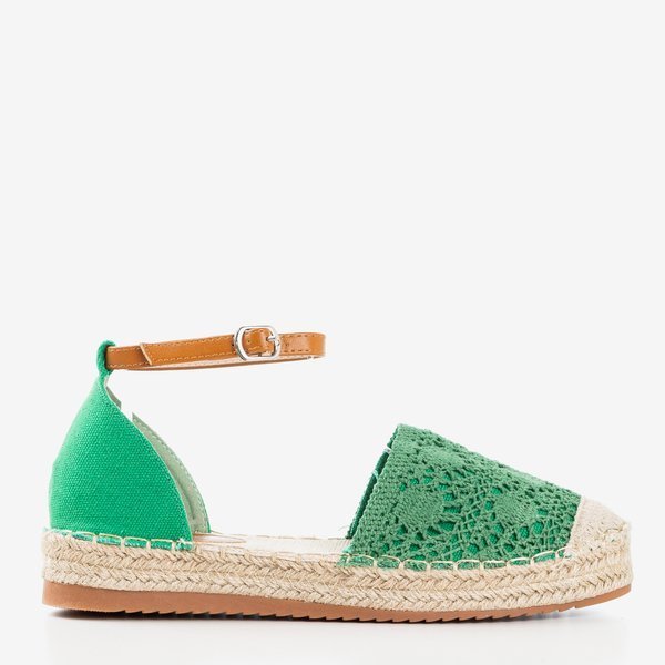 - Dámské zelené sandály espadrilles. Vyrobeno z tkaniny pokryté prolamovanou krajkou. Látková stélka s podšívkou. Zapínáno přezkou. Podešev je zdobena pletenou jutovou šňůrou. Klasický model, který bude perfektní pro každodenní použití!