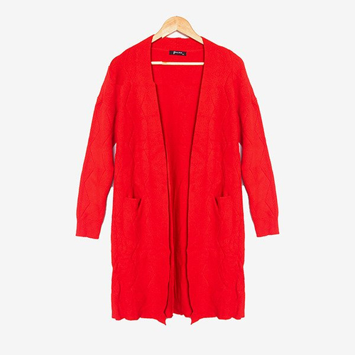 - Dámský svetr červený vzorovaný, žádné zapínání. Model s dlouhými rukávy a kapsami. Skvělý doplněk k příležitostným stylizacím. POZNÁMKA: Přesnost měření (+/-) 1 cm.