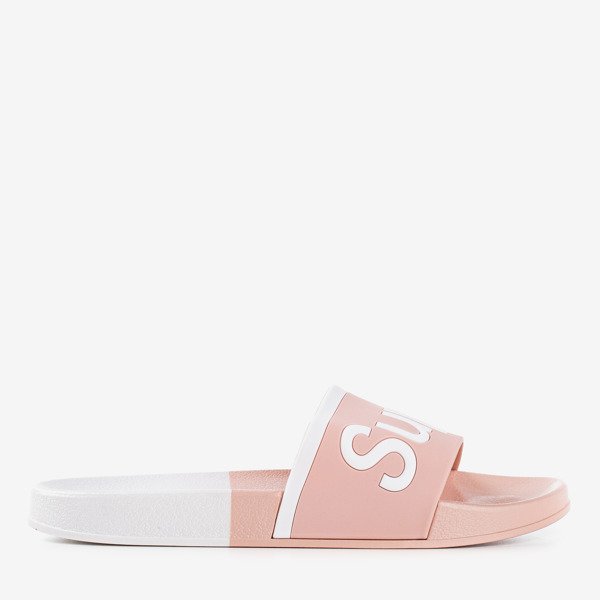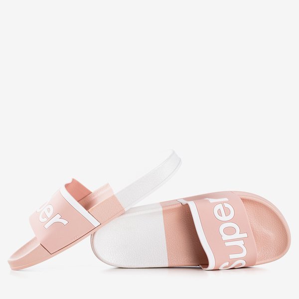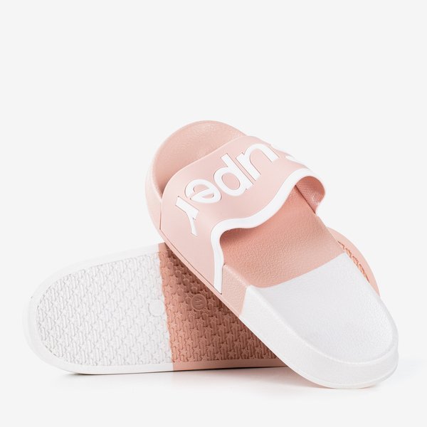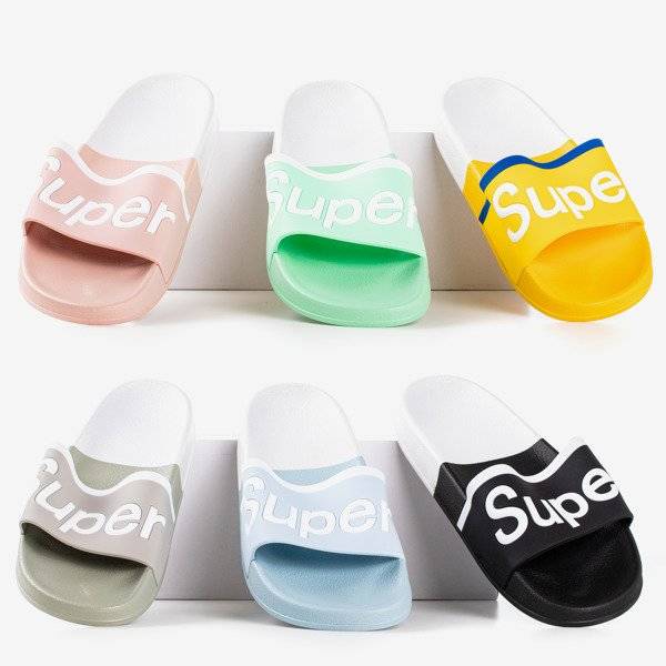 - Dámské pantofle vyrobené z gumového materiálu. Růžový a bílý model. Pás s nápisem „SUPER“. Perfektní boty do bazénu. POZNÁMKA: Model modelu může mít na podrážce zbarvení. Poznámka: produkt má na materiálu změnu barvy.