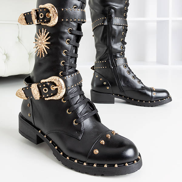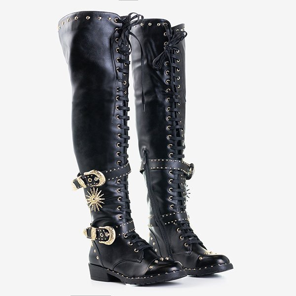 - Dámské dlouhé boty z umělé kůže. Svršek zdobí zlaté trysky, spony a špendlíky. Šněrovací model a zip. Dokonale zdůrazní jakoukoli stylizaci!