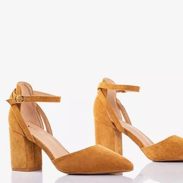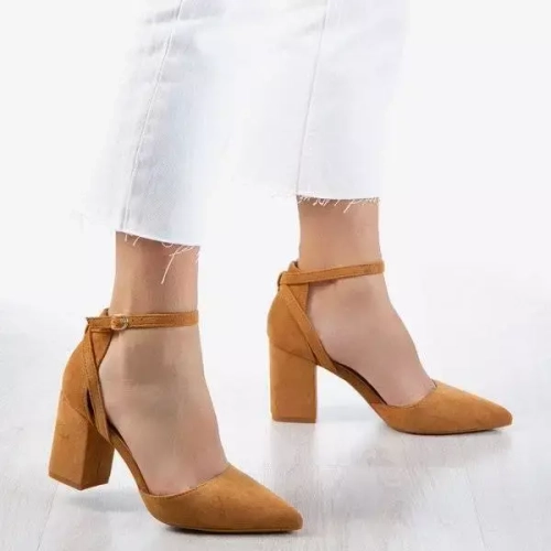 - Dámské lodičky na vysokém sloupku z ekologické hnědé kamzíkové kůže. Stélka je potažena ekologickou kůží. Nos je zakončen špičatou špičkou. Poznámka: výrobek má na materiálu stopy lepidla.