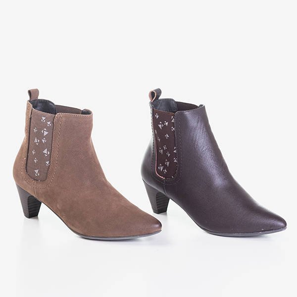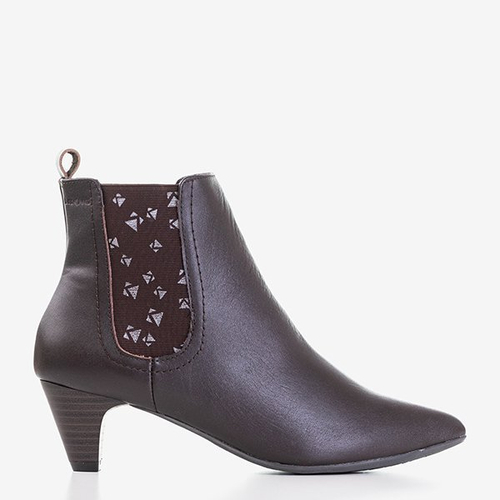 - Dámské boty na nízkém sloupku z ekologické kůže - matné. Pružné gumy na bocích svršku jsou zdobeny geometrickými vzory. Stélka je pokryta eko semišem, špička je špičatá. Moderní boty na podzim!