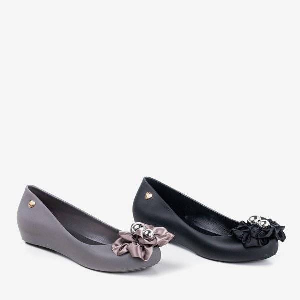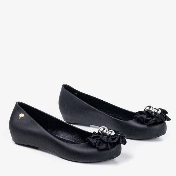 - Černé baleríny Melissa na vnitřním klínu. Obuv je vyrobena z gumy, stélka z plastu. Baletky jsou zdobeny květinami se stříbrnými perlami. Boty mají špičku. Pohodlná neformální obuv