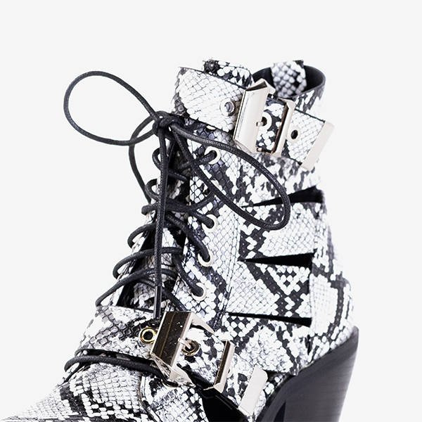 - Funky dámské kovbojské boty s barevným reliéfem z hadí kůže. Svršek s výřezy, má 2 ozdobné spony. Model je vyroben z ekologické kůže, nemá žádnou izolaci. Budou dokonalým doplňkem vašeho kabátu!