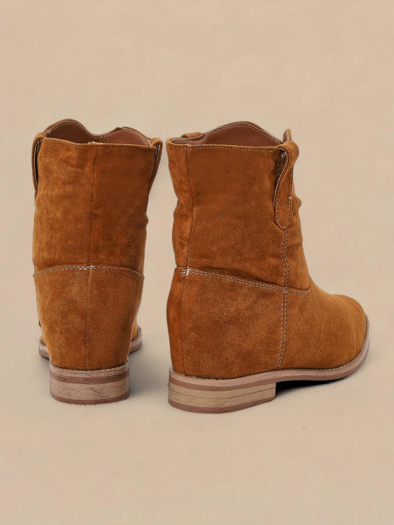 - Kozačky a'la kovbojské boty na nízkém klínu z ekologické semišové kůže. Boty jsou nazouvací a uvnitř mají měkkou kožešinovou podšívku. Hodí se k mnoha ženským stylizacím.