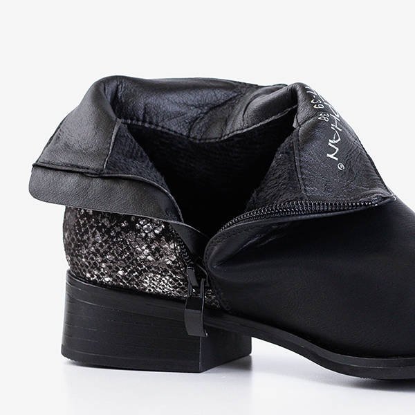 • Originální dámské boty s plochými podpatky v černé barvě. Svršek je vyroben z ekologické kůže, v zadní části má látkovou vložku, která je zdobena potiskem hadí kůže. Model se zapíná na zip na boku.