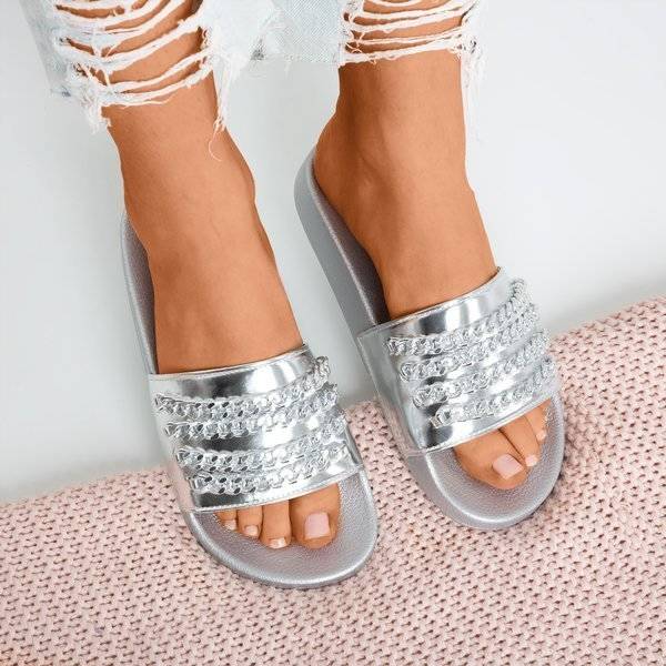 - Dámské letní pantofle ve stříbrné barvě. Popruh z ekologické kůže, zdobený připevněnými řetízky. Gumová podrážka. Poznámka: výrobek má na materiálu škrábance.