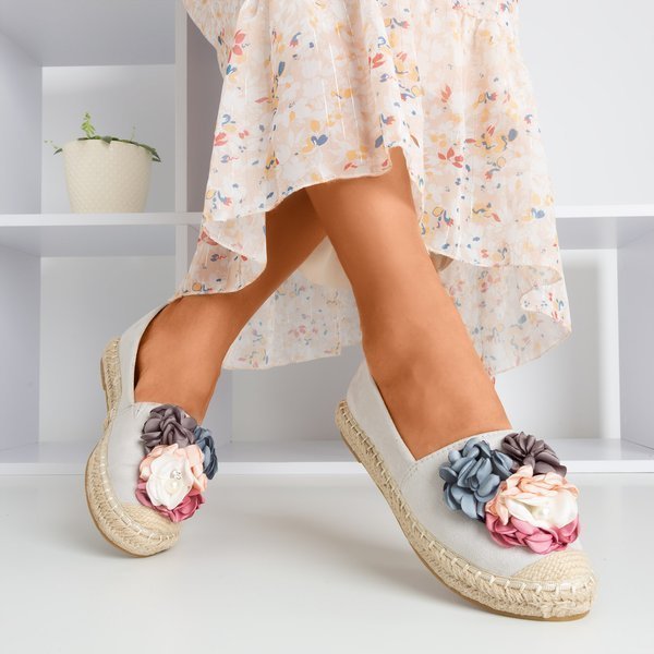 • Klasické dámské espadrily v šedé barvě. Vyrobeno z eko semišové kůže. Nos má látkové květiny. Podešev je zdobena jutovým provázkem. Látková podšívka. Ideální pro džíny