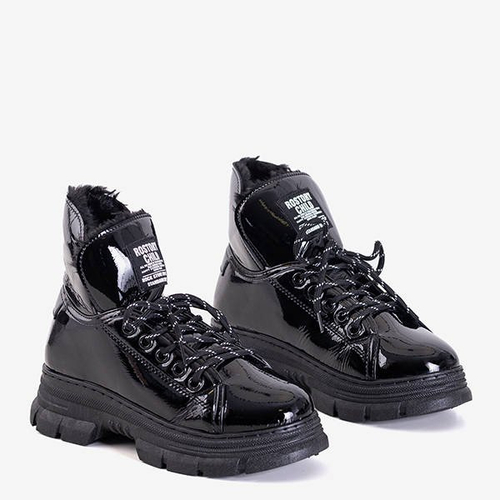 - Dámské turistické boty vyrobené z černé lakované ekologické kůže. Šněrovací model, má po stranách výřezy a uvnitř teplý kožíšek. Tyto boty budou skvělým doplňkem vašeho sportovního stylu.