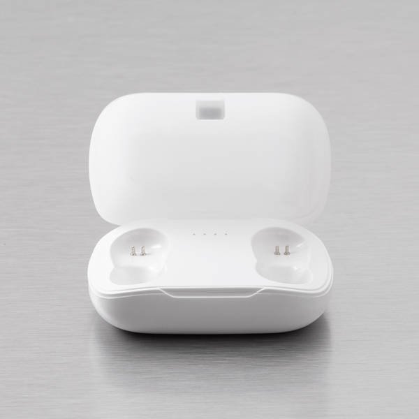 - Bílá bezdrátová sluchátka: 3 tlačítka (ovládání hlasitosti hudby a hovorů), univerzální (iOS a Android), twist lock, výdrž baterie až 8 hodin. Sada obsahuje: sluchátka, pouzdro s nabíječkou, kabel USB, silikonová špunty.