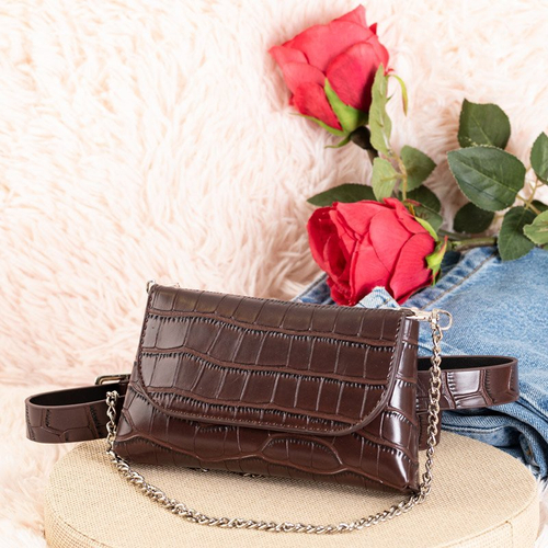 - Malá dámská kabelka na stříbrném řetízku, vyrobená z ekokože, zakončená zvířecí ražbou. Má další tenčí řetízek a nastavitelný řemínek, na který můžete vak zavěsit a nosit kolem pasu.