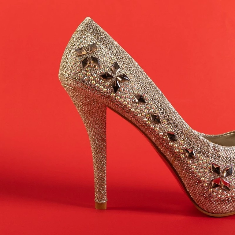 OUTLET Zlaté dámské lodičky na jehlovém podpatku s dekoracemi od Polinari - Footwear