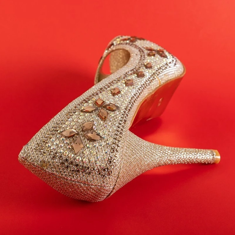 - Elegantní dámské lodičky na vysokém podpatku s výřezem na špičce, svršky z látky s lesklou nití a navíc zdobené kubickým zirkonem a kamínky. Poznámka: výrobek má na materiálu stopy lepidla.