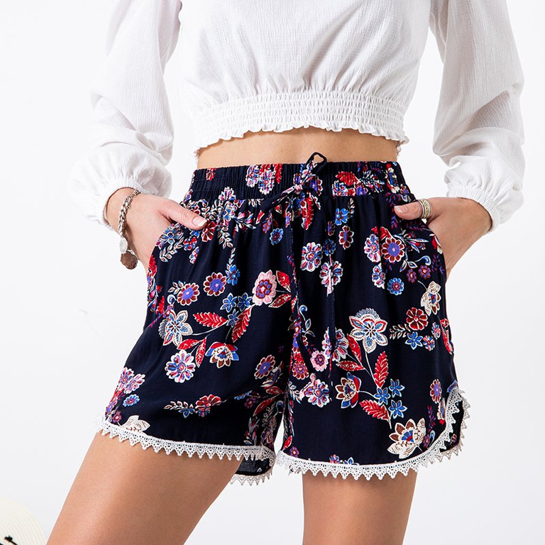 Dámské tmavě modré kraťasy s červenými květy - Oblečení