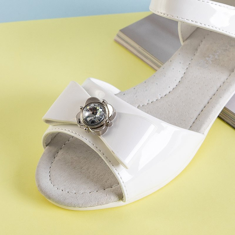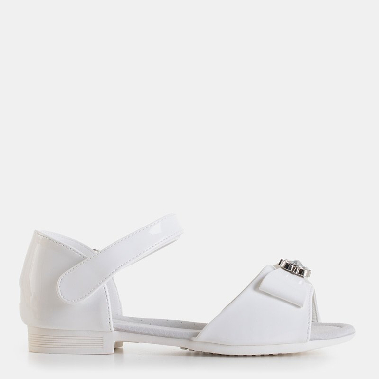 - Elegantní dívčí sandály s plochými podpatky, vyrobené z lakované kůže. Obuv se zapíná na suchý zip, stélka podšitá přírodní kůží. Model je zdoben mašlí na špičce. Budou ladit jak k sukni, tak k šatům.