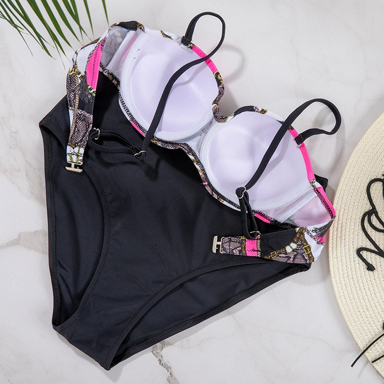 • Plavky s listovým vzorem, mimořádně módní. Bikiny mají vysoký pas, horní část oblečení je zapnuta patentkou a popruhy jsou nastavitelné. Push-up podprsenka POZNÁMKA: Přesnost měření (+/-) 1 cm.