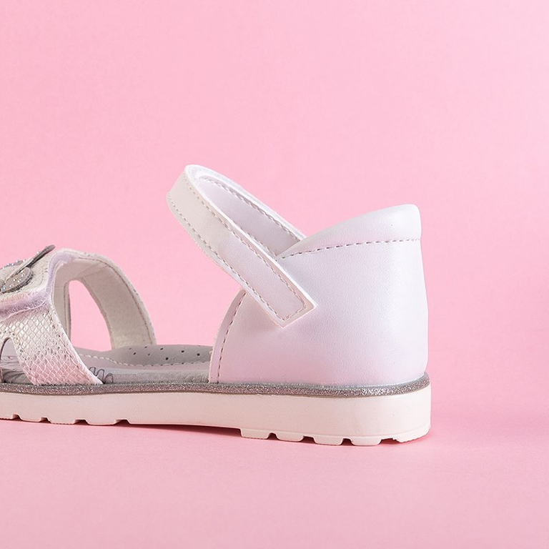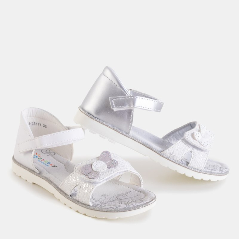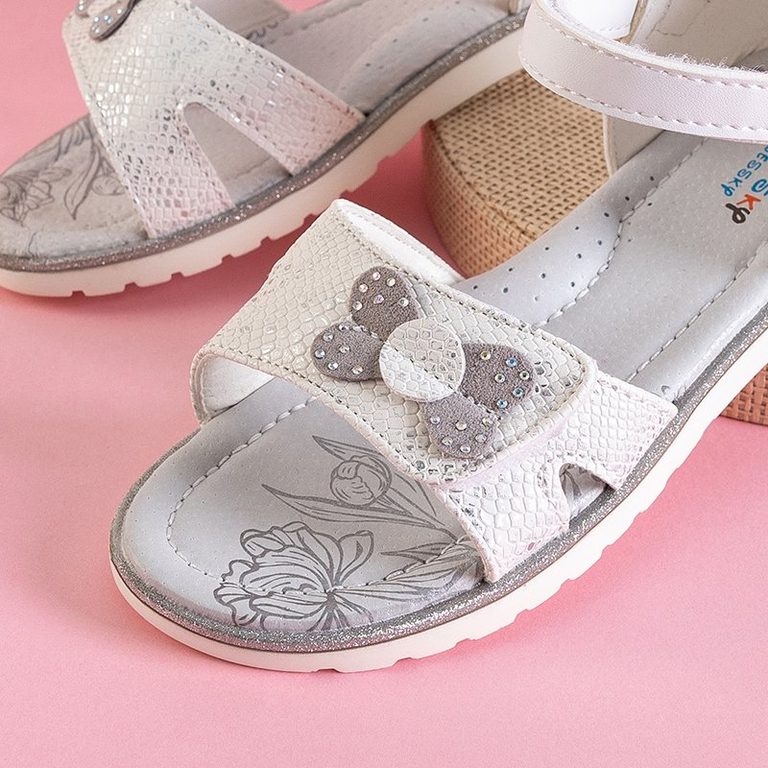 - Krásné dívčí sandály s plochými podpatky, vyrobené z ekokože, částečně ukončené ražbou z hadí kůže. Pohodlí zajišťuje měkká kožená stélka s polštáři. Model se zapíná na suchý zip, mašle se zirkony na nose.